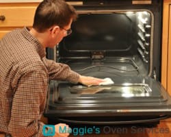 - Clean the door of the oven with degreaser and the back side of a sponge.